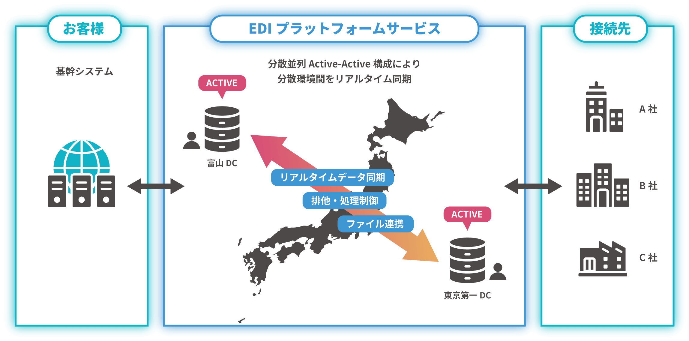 常にActive-Active構成で動作するため、一方の拠点で障害が発生しても、もう一方の拠点がシームレスに処理を継続します。これにより、システム停止時間を実質ゼロに抑えることが可能です。