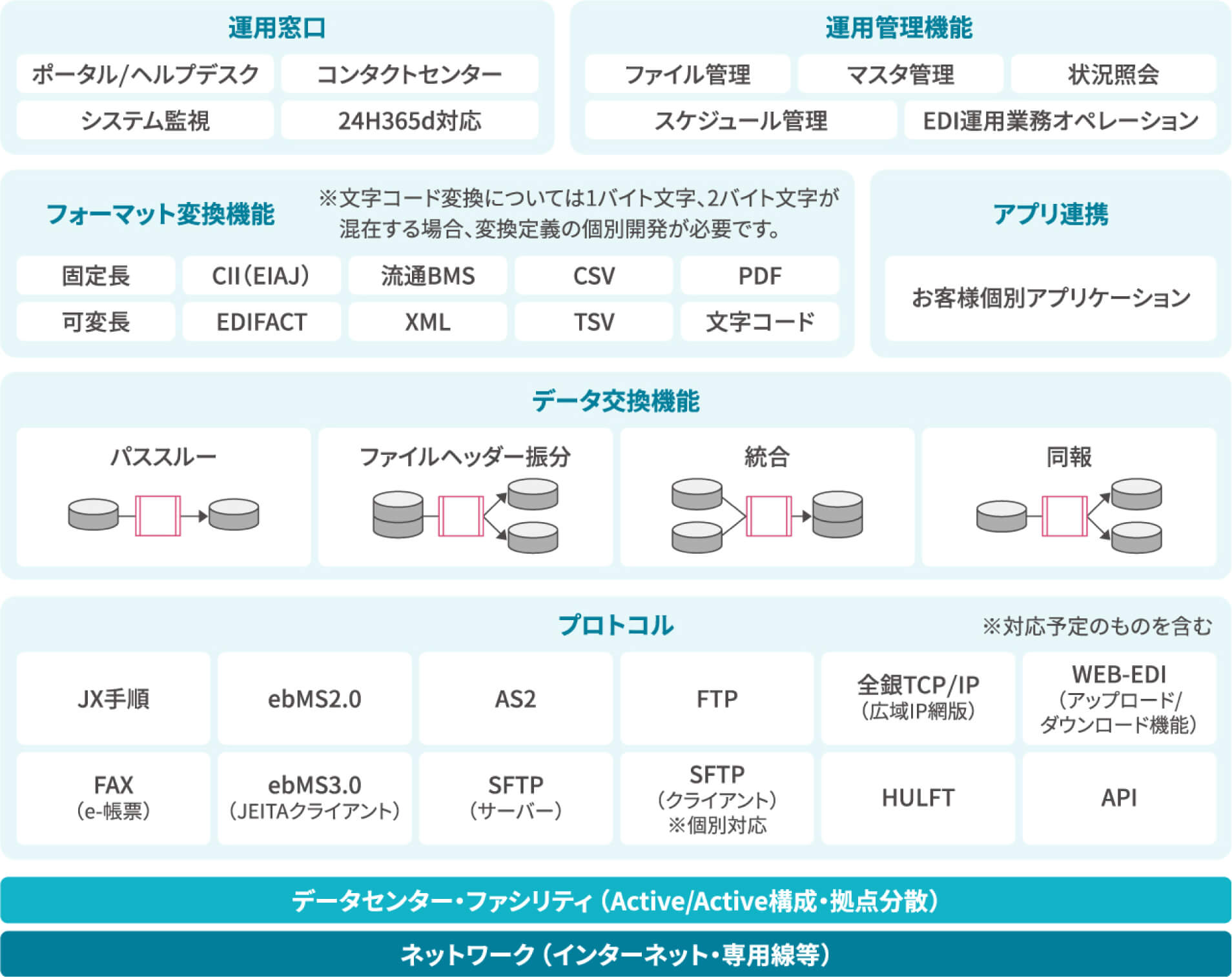 24時間365日対応可能なヘルプデスク業務をはじめ、豊富なフォーマット・データ交換機能やアプリ連携などを用意しております。データセンターやネットワークインフラなどインテックの強みを生かし、お客さまのEDI環境に合わせたあらゆる対応が可能です。
