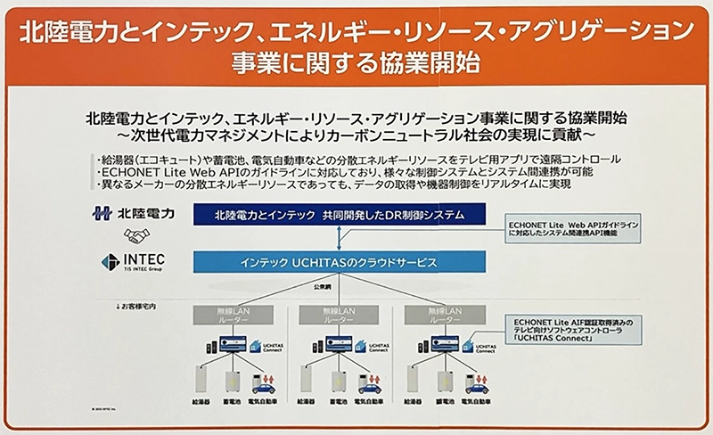 この取り組みでは、インテックと北陸電力で共同開発したDR制御システムと、インテックのクラウドHEMSサービスを使って、蓄電池や電気自動車などの分散エネルギーを遠隔コントロールすることができます。また、ECHONET LiteのWeb APIのガイドラインに対応しており、さまざまな制御システムとの連携が可能で、さらに、異なるメーカーの分散エネルギーリソースでもデータ取得や機器制御を実現しています。
