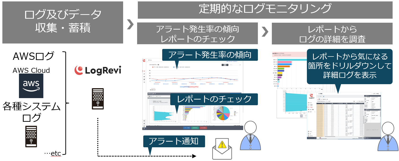 「LogRevi」は企業内に存在するさまざまなシステムのログを統合管理することに加え、統合ログ管理に必要な機能を搭載し、導入企業のログ活用をサポートします。今回、Cloud Receiver for AWSを機能追加することで、AWSのセキュリティ監査ログを収集できるようになり、万が一インシデントが発生した場合、発生した経路や原因などの状況を付属のレポートテンプレートを利用して簡単に分析が可能となります。