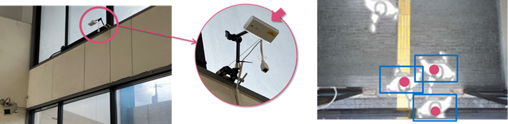 駅構内を利用する人数は、目視による計測結果を基準に比較した場合、誤差は3%以内に収まり、高精度な計測結果が得られた。なお、AIカメラの画角は、人物の判定を頭頂部で行う「真下画角モード」が最も有効であり、これにより人物同士の重なりによる誤検知を抑制できた。
