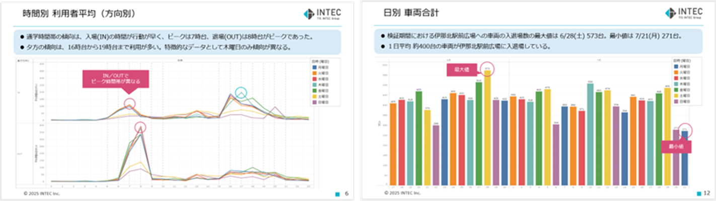 ピーク時間や曜日別の傾向、入退場数の差、公共交通機関や地域内イベントとの相関関係など、JR伊那北駅の利用実態を把握することができた。これらのデータは、駅周辺の再整備における歩行者の安全を確保する通路設計や混雑を緩和する駅舎内の空間構成、駐停車スペースの動線設計などに活用でき、実態に即した施策の検討に資することが確認できた。