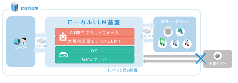 そこでインテックは、生成AI活用に向けた初期段階の検証を安全かつ迅速に実施できる環境の必要性を認識しました。長年培ってきた豊富なインフラ構築実績や自社サービス運用のノウハウを結集し、安全なローカルLLM環境の導入と運用開始を短期間で実現することで、企業の生成AI活用を本格展開へとつなげることを目的に、ローカルLLMの導入支援を開始しました。