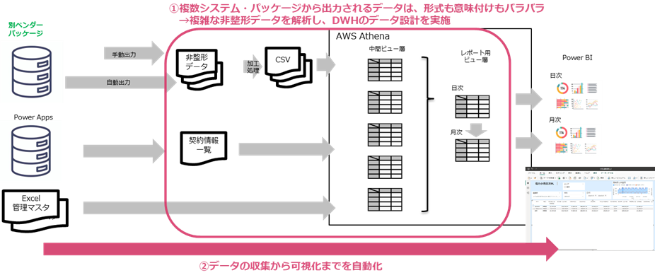 複数システム、パッケージから出力される形式や意味付けが不統一な非構造化データを解析して連携することで、手動でデータの突き合わせを行う業務を半自動化、データ収集・集計作業の属人化を解消しつつ、帳票作成の業務効率化を実現。