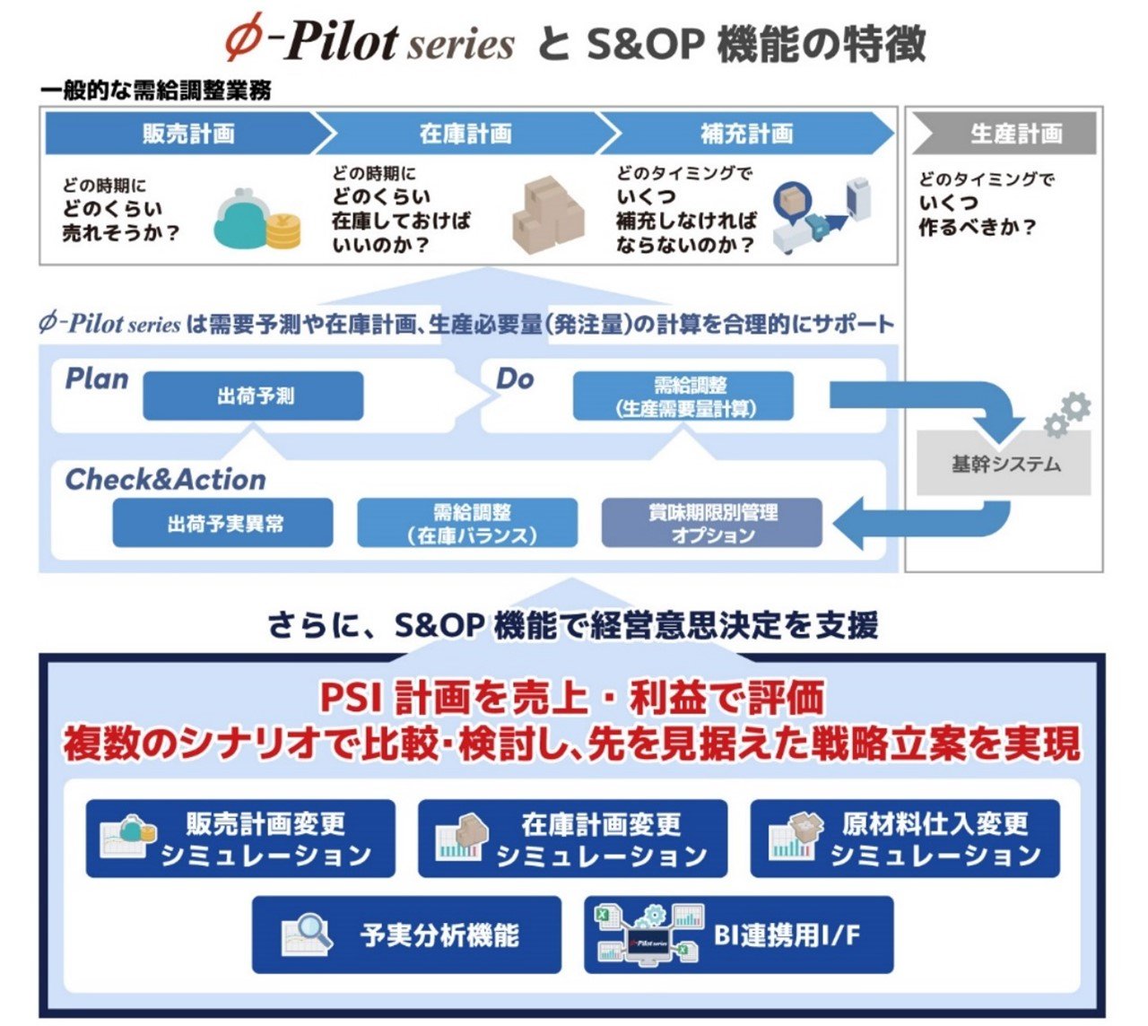 今回両社が共同開発したS&OP機能は、「Φ-Pilot」の需給調整機能に利益目標の達成に向けた視点を取り入れることで、全社最適化された需給計画の立案を支援します。S&OPの中核要素である販売計画、在庫計画、仕入計画を対象に、利益影響を考慮したシミュレーションを可能とし、現場業務の効率化・高度化に加え、経営判断に必要な情報の可視化・最適化を実現します。