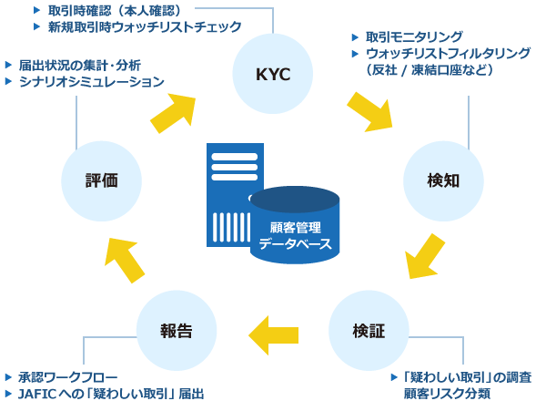 取引モニタリングや反社会的勢力、凍結口座名義人のフィルタリング、疑わしい取引の届出業務を支援します。