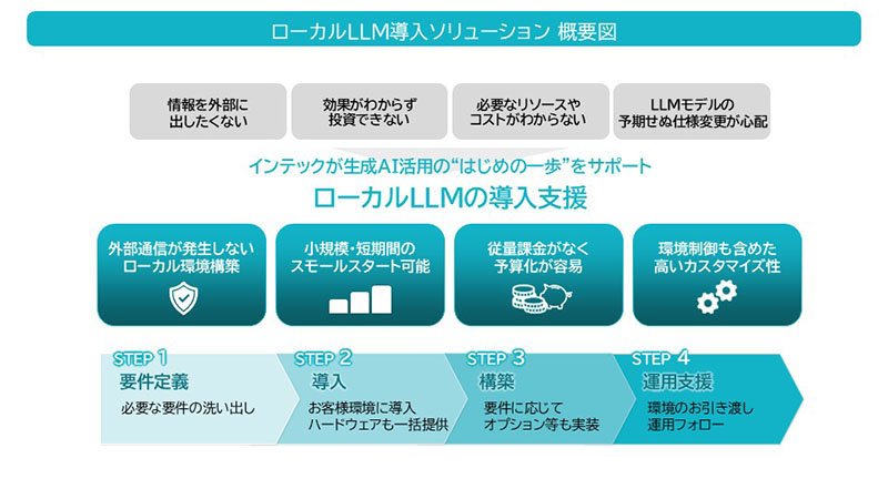 インテックが長年培ってきた豊富なインフラ構築実績や自社サービス運用のノウハウを活かし、ローカルLLMの導入時だけでなく、導入後のサポートも実施します。