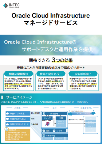 Oracle Cloud Infrastructureマネージドサービスは、オラクル社が提供する企業向けパブリッククラウドサービスであるOracle Cloud Infrastructure(以下、OCI)の調達や運用業務をインテックでサポートまたは代行するサービスです。